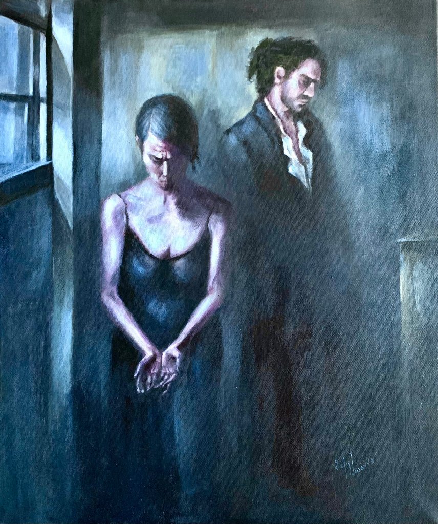 γυναίκα, ντυμένη στα μαύρα, μιλάει σ’ έναν νέο. Δεν έχουν ανάψει